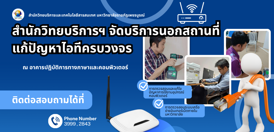 วันที่ 15 ต.ค. 2568 สำนักวิทยบริการและเทคโนโลยีสารสนเทศ มหาวิทยาลัยราชภัฏเพชรบูรณ์ กำหนดการออกให้บริการนอกสถานที่ ณ อาคารปฎิบัติการทางภาษาและคอมพิวเตอร์ โดยมีวัตถุประสงค์เพื่อให้คำแนะนำด้านเทคโนโลยีสารสนเทศและช่วยแก้ไขปัญหาการใช้งานต่าง ๆ