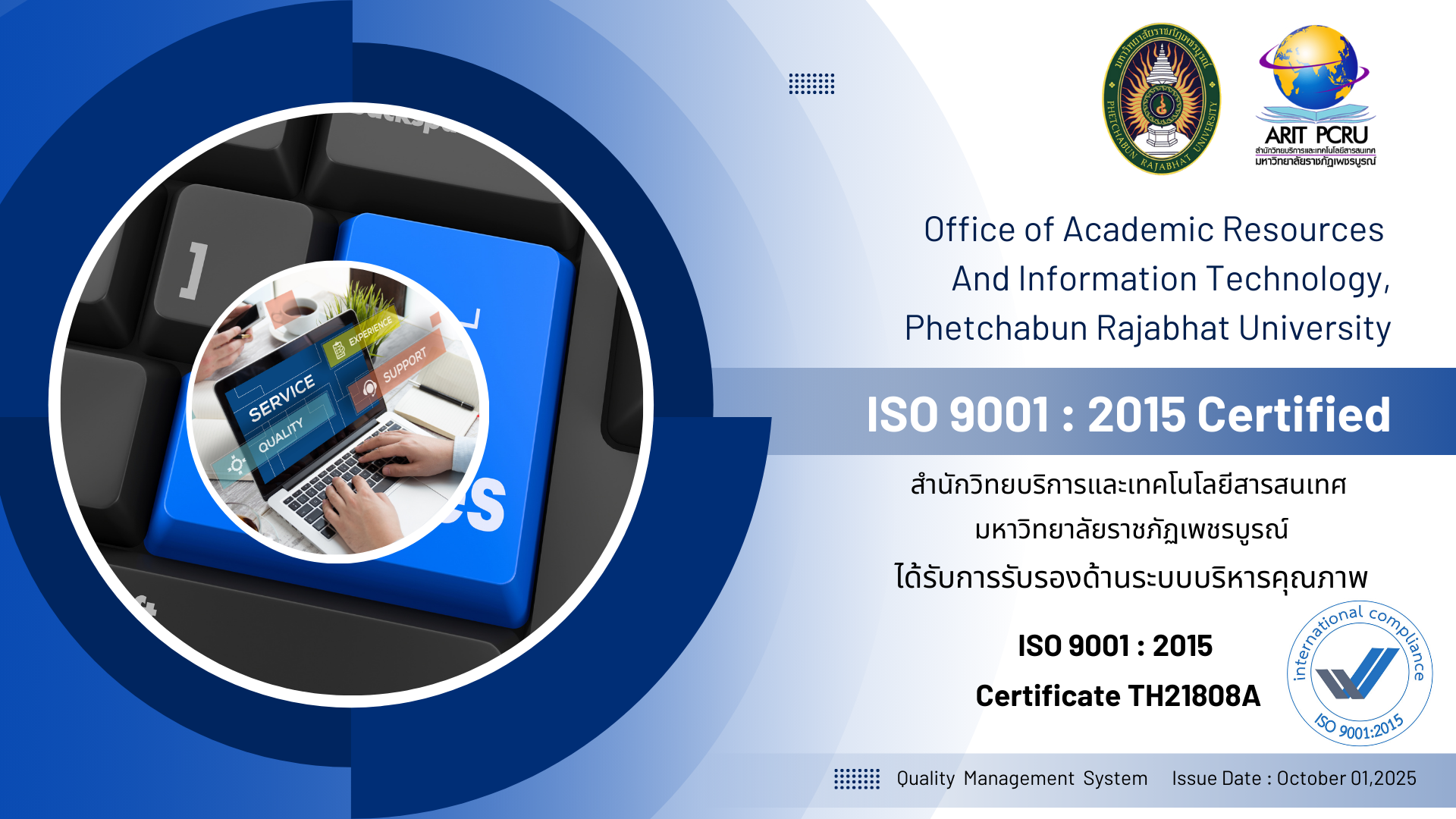 สำนักวิทยบริการและเทคโนโลยีสารสนเทศ ได้รับการรับรองระบบบริหารคุณภาพ ISO 9001 : 2015 ระหว่างวันที่ 1 ตุลาคม 2568 ถึง 30 กันยายน 2569 ภายใต้ขอบเขต การให้บริการด้านงานบริหาร งานบริการหอสมุดกลาง งานบริการคอมพิวเตอร์และเทคโนโลยีสารสนเทศฯ งานวิจัยและพัฒนาซอฟต์แวร์ฯ รวมถึงการบริหารจัดการระบบเครือข่าย