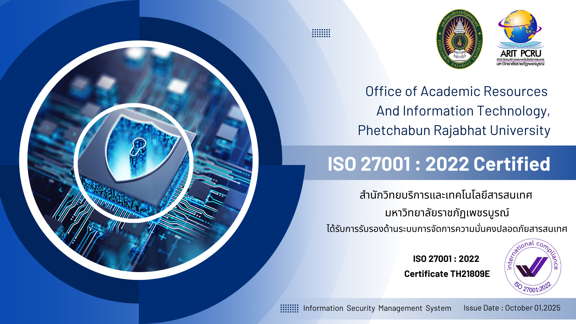 สำนักวิทยบริการและเทคโนโลยีสารสนเทศ ได้รับการรับรองระบบการจัดการความมั่นคงปลอดภัยสารสนเทศ ISO/IEC 27001 : 2022 ระหว่างวันที่ 1 ตุลาคม 2568 ถึง 30 กันยายน 2569 ภายใต้ขอบเขต การรับรองระบบการจัดการความมั่นคงปลอดภัยสารสนเทศ ซึ่งครอบคลุมการบริหารจัดการความเสี่ยงด้านข้อมูลสารสนเทศ การดูแลระบบศูนย์ข้อมูล (Data Center) และระบบสารสนเทศสำคัญของมหาวิทยาลัย เพื่อให้ข้อมูลมีความถูกต้อง ปลอดภัย และพร้อมใช้งาน รองรับการดำเนินงานและภารกิจของมหาวิทยาลัยอย่างมีประสิทธิภาพ