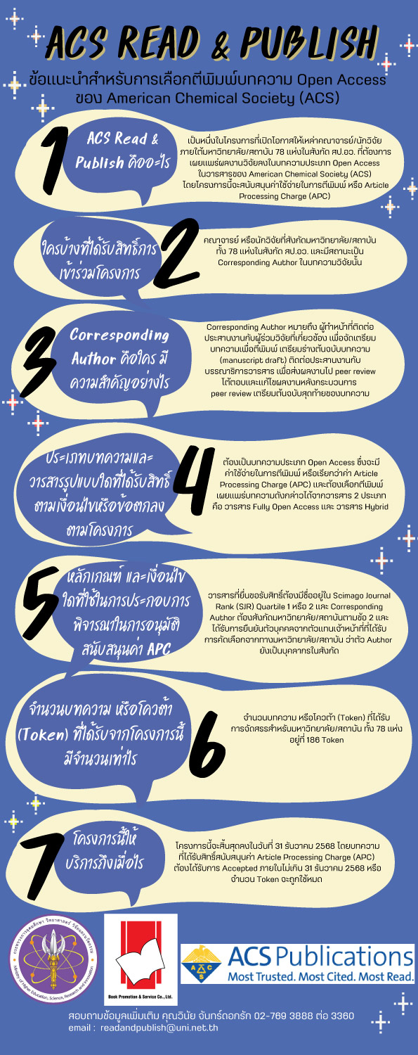 ด้วยสำนักงานปลัดกระทรวงการอุดมศึกษา วิทยาศาสตร์ วิจัยและนวัตกรรม ร่วมกับ บริษัท บุ๊ค โปรโมชั่น แอนด์ เซอร์วิส จำกัด ในการสนับสนุนการตีพิมพ์บทความวิชาการในวารสารของสำนักพิมพ์ American Chemical Society (ACS) ที่เป็น Open Access (OA) จำนวน 45 Tokens ให้กับสถาบันการศึกษาโดยไม่มีค่าใช้จ่าย รายละเอียดเพิ่มเติมด้านล่าง