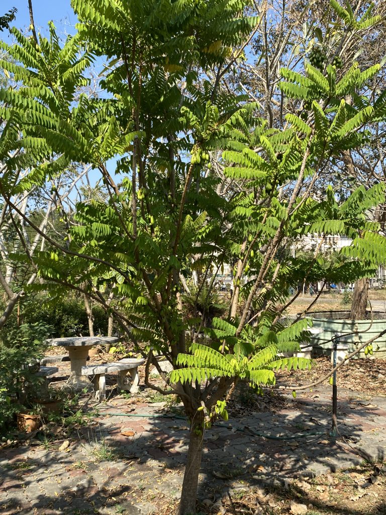 ไม้ต้นขนาดเล็ก สูง 5-10 เมตร ใบประกอบแบบขนนกชั้นเดียวปลายคี่ เรียงสลับ มีใบย่อย 20-40 ใบ ใบย่อยรูปขอบขนานถึงรูปใบหอก ยาว 5-7 เซนติเมตร ปลายแหลม ช่อดอกแบบช่อกระจุกแยกแขนง ออกตามกิ่งหรือบริเวณลำต้น ดอกสีแดงอมม่วง กลีบเลี้ยง โคนเชื่อมติดกันเล็กน้อย ปลายแยกเป็น 5 แฉก รูปไข่ถึงรูปใบหอก กลีบดอกโคนเชื่อมติดกันเป็นหลอดสั้น ปลายแยกเป็น 5 แฉก รูปขอบขนานแกมรูปแถบ สีแดงอมม่วง โคนกลีบสีขาวนวล เกสรเพศผู้ 10 เกสร ผลแบบผลมีเนื้อหนึ่งถึงหลายเมล็ด รูปทรงกระบอกถึงรูปขอบขนาน รอบผลมีร่องตื้น ผลสดสีเขียวอ่อนอมเหลือง เมล็ดแบน รสเปรี้ยว