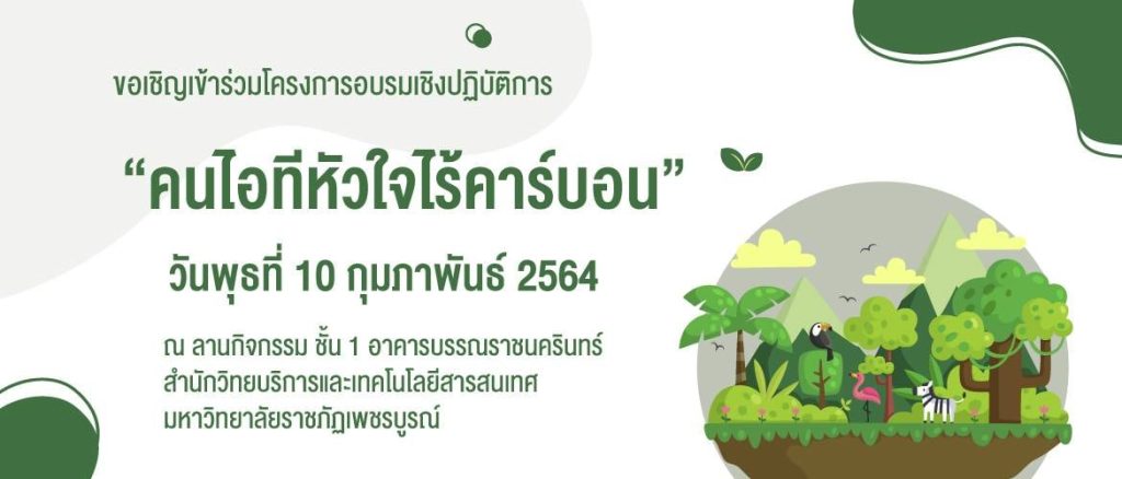 วันพุธที่ 10 กุมภาพันธ์ 2564 สำนักวิทยบริการและเทคโนโลยีสารสนเทศโดยงานหอสมุดกลางได้จัดโครงการอบรมเชิงปฏิบัติการ “คนไอทีหัวใจไร้คาร์บอน” ขึ้น โดยมี ผู้ช่วยศาสตราจารย์ ดร.เดือนฉาย ไชยบุตร ผู้อำนวยการสำนักวิทยบริการฯ ให้เกียรติเปิดโครงการอบรมฯ และทีมวิทยากรนำโดยท่านผู้ช่วยอธิการบดี อาจารย์พิณทิพย์ แก้วแกมทอง อาจารย์พรทวี กองร้อย ประธานหลักสูตรวิทยาศาสตร์สิ่งแวดล้อม อาจารย์อิสระ ตั้งสุวรรณ์ และอาจารย์ธนาวรรณ์ พิณณ์เวช อาจารย์ประจำหลักสูตรสาขาวิทยาศาสตรสิ่งแวดล้อม ให้เกียรติเป็นวิทยากร ในการจัดอบรม ครั้งนี้ โดยมควัตถุประสงค์เพื่อให้บุคลากร อาจารย์ นักศึกษา และผู้สนใจ ได้มีความรู้ในการชดเชยคาร์บอนของตนเอง และตระหนักถึงการเกิดสภาวะเรือนกระจกของโลกในปัจจุบัน