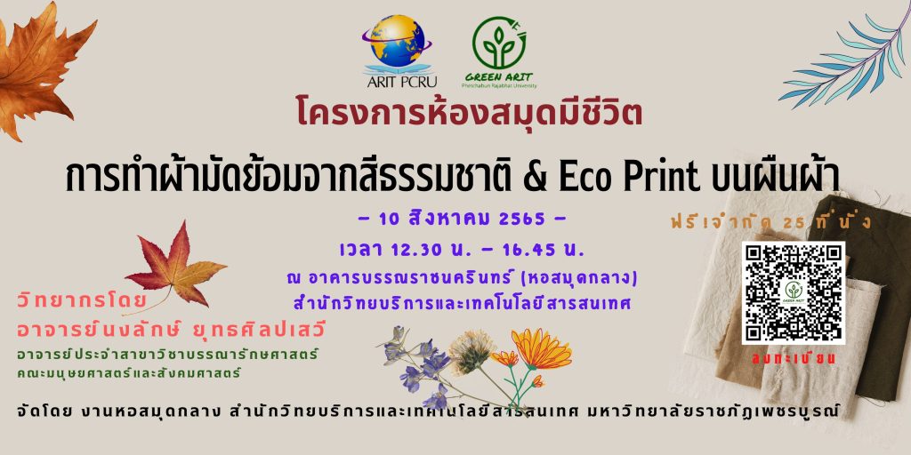 งานหอสมุดกลาง สำนักวิทยบริการและเทคโนโลยีสารสนเทศ มหาวิทยาลัยราชภัฏเพชรบูรณ์ ได้จัดโครงการห้องสมุดมีชีวิต : การทำผ้ามัดย้อมจากสีธรรมชาติ & Eco Print บนผืนผ้า โดยได้รับเกียรติจากวิทยากรผู้ทรงคุณวุฒิ อาจารย์นงลักษณ์ ยุทธศิลปเสวี อาจารย์ประจำสาขาวิชาบรรณารักษ์ศาสตร์ เป็นวิทยากร โดยโครงการเน้นกิจกรรมที่ส่งเสริมการนำวัสดุเหลือใข้และวัสดุธรรมชาติ มาใช่ในการทำผ้าในรูปบบของ ECo Print ซึ่งจัดขึ้นเมื่อวันพุธที่ 10 สิงหาคม 2565 ณ อาคารบรรณราชนครินทร์ (หอสมุดกลาง)