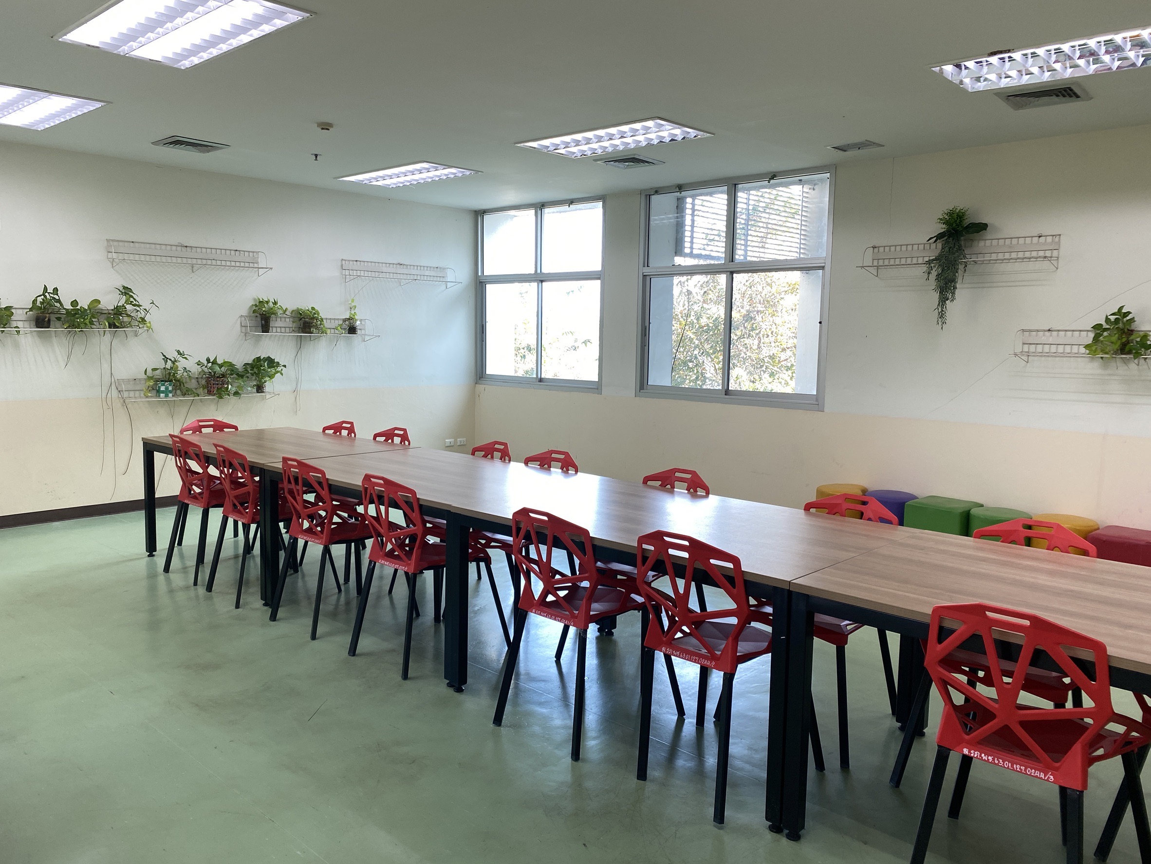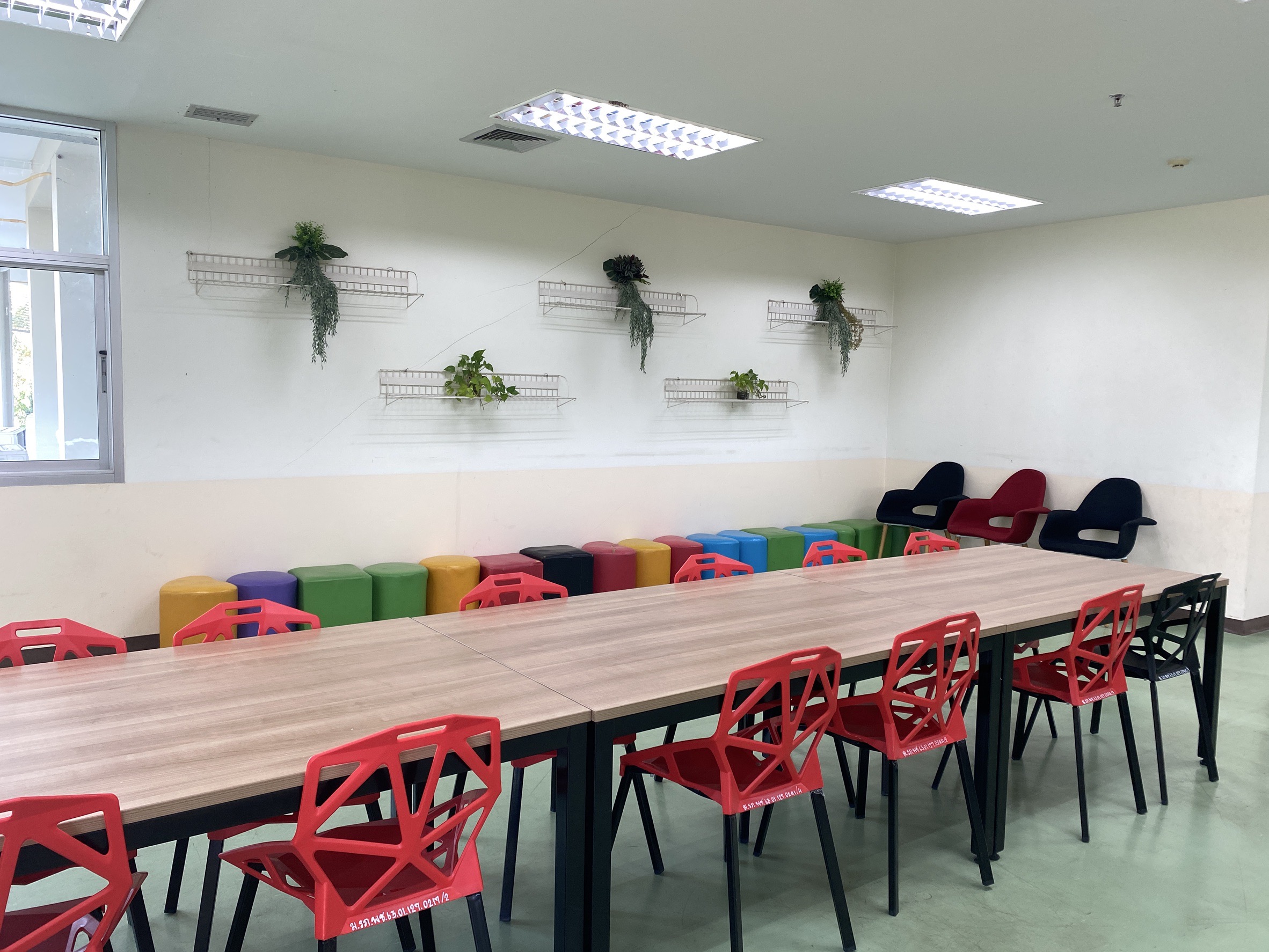 มุมอ่านหนังสือที่ชั้น 2 บรรยากาศผ่อนคลาย ที่ผสมผสานเข้ากับธรรมชาติอย่างลงตัว มีพลูด่างและไม้ประดับช่วยฟอกอากาศและพักสายตา พร้อมกับแสงธรรมชาติจากหน้าต่าง ทำให้ห้องดูโปร่งสบาย