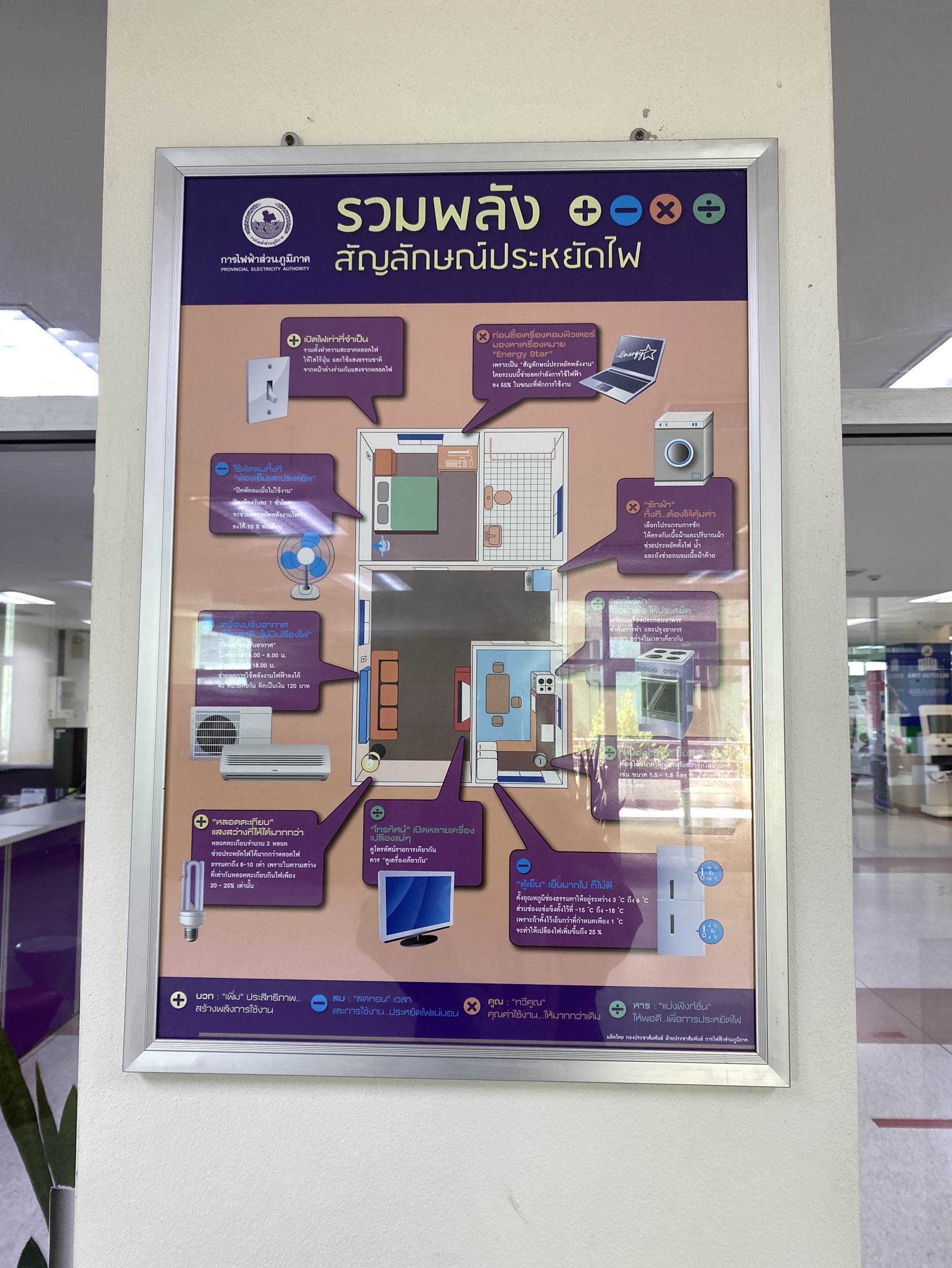 • ปิดเมื่อเลิกใช้: รณรงค์ให้ผู้ใช้บริการและบุคลากร “ปิดไฟ” ทุกครั้งหลังจากเสร็จสิ้นการใช้งาน เพื่อลดการใช้พลังงานที่ไม่จำเป็น