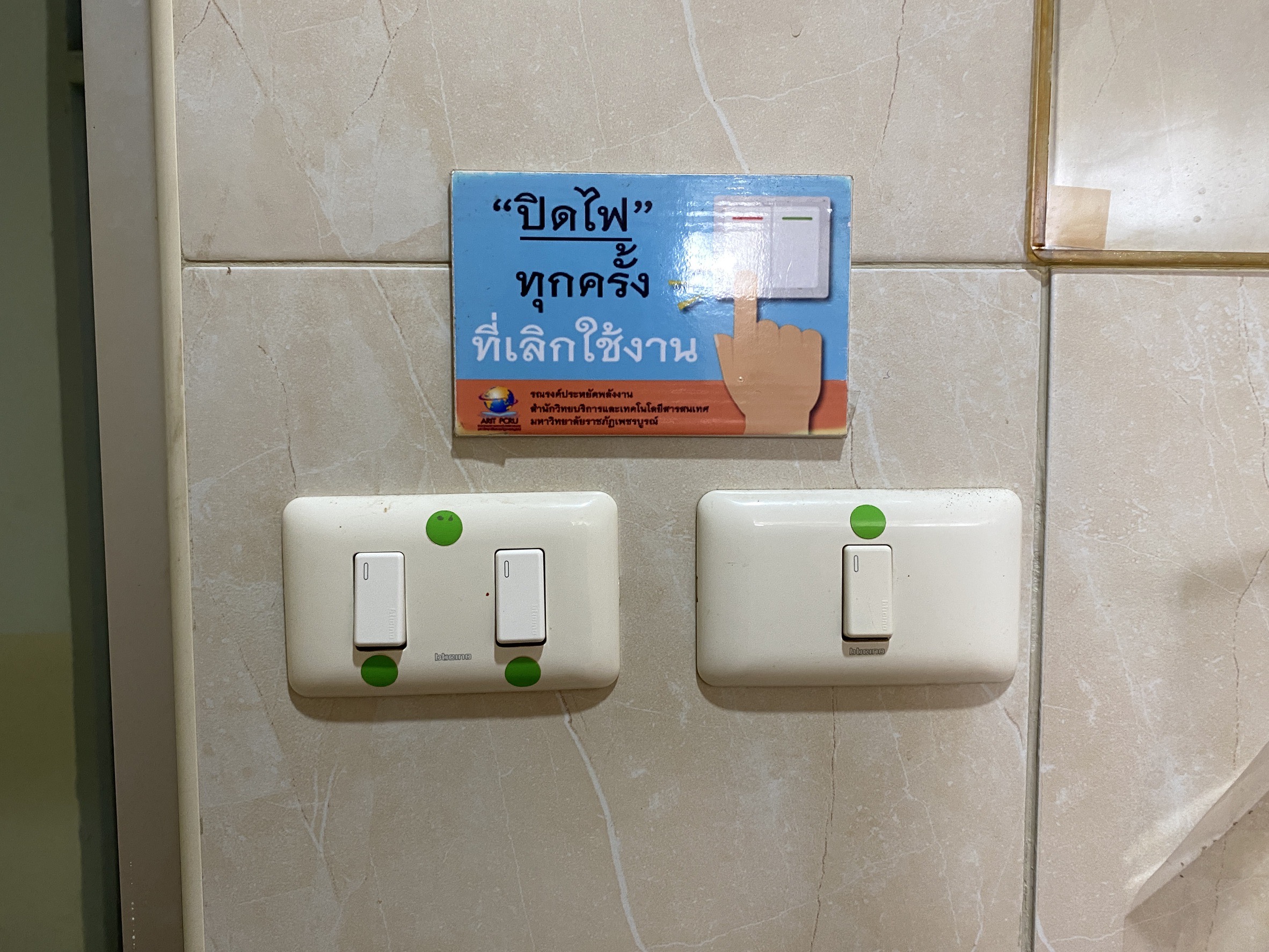 • มีการติดสัญลักษณ์สีเขียวที่สวิตช์ไฟ เพื่อช่วยให้จดจำง่ายและสร้างนิสัยการประหยัดพลังงานจนเป็นกิจนิสัย